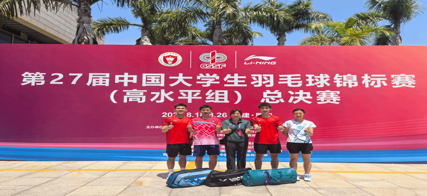 2025年8月18日-25日,第27届全国大学生羽毛球锦标赛(总决赛)在福建厦门杏林体育馆举办。我校羽毛球队由邹师思老师带队,荣获高水平组男子双打第五名,实现了新的突破。